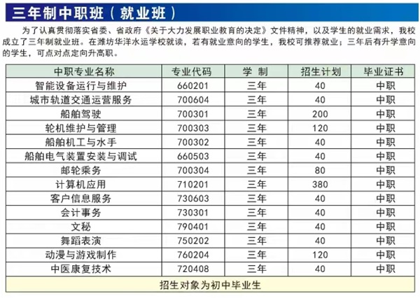 (1) 濰坊華洋水運學校初中起點中專班的學生,凡在校系統(tǒng)學習文化基礎課和專業(yè)綜合技術課滿三年,學校可推薦就業(yè);如想升學可參加當年的春季高考。達到當年高職、本科錄取分數(shù)線,可升入相應的高職、本科院校就讀;