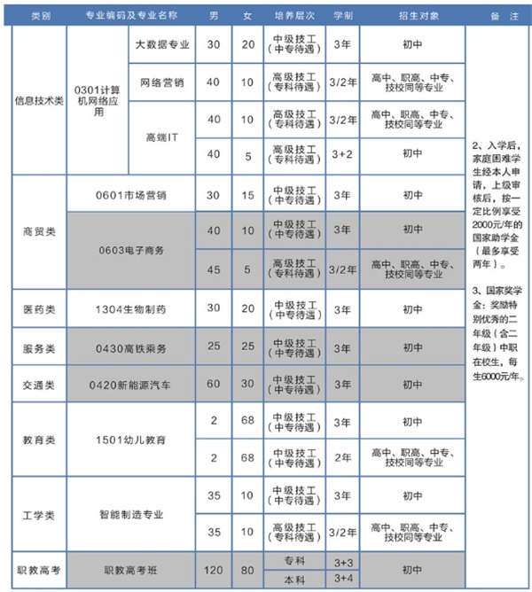 1、初中起點3年制為中級技工(中專待遇),5年制為高級技工(專科待遇);高中起點3年制為高級技工(專科待遇);初中起點3+2為前三年中級技工(中專待遇),后兩年高級技工(專科待遇)的培養模式。