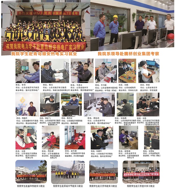 近年來山東煤炭技師學院電力工程系依托辦學優勢,適應市場發展的需求,大力加強新能源科學與工程、火電廠熱力設備運行與檢修、火電廠集控運行、發電廠及變電站電氣設備安裝與檢修、供用電技術、生物制藥、幼兒教育、計算機網絡應用、電子商務、新能源汽車、人工智能、工業機器人等方向的專業建設,簽訂校企合作協議。大力推進電力“新型學徒制”教學精品班,深化工學一體化教學。秉承校企合作、高薪就業、終身服務的理念,先后與省內外央企、國企、地方國企、大型民營企業等110余家知名企業(中國節能集團、青島電廠、日照電廠、海信集團、川能集團、世界五百強魏橋集團、京東集團、格力集團等),簽訂了合作培養協議建立良好的培訓就業關系,學生畢業即就業。
