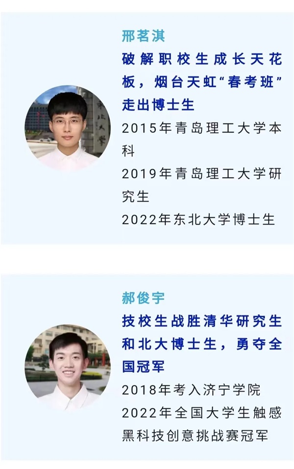 山東省層面:2020年1月教育部和山東省人民政府聯(lián)合發(fā)布《關(guān)于整省推進提質(zhì)培優(yōu)建設(shè)職業(yè)教育創(chuàng)新發(fā)展高地的意見》,意見指出:本科招生計劃安排逐步達到應(yīng)用型本科高校本科招生計劃的30%。國家層面:2021年10月中共中央辦公廳、國務(wù)院辦公廳印發(fā)了《關(guān)于推動現(xiàn)代職業(yè)教育高質(zhì)量發(fā)展的意見》中強調(diào):到2025年,職業(yè)本科教育招生規(guī)模不低于高等職業(yè)教育招生規(guī)模的10%。2022年5月1日新修訂的《中華人民共和國職業(yè)教育法》正式施行,明確提出職教與普教同等重要地位,將職業(yè)教育的地位提高到一個新的高度!總之,在國家大力發(fā)展職業(yè)教育的背景下,春季高考沒有高中生競爭、到2025年本科計劃將比2021年增長13.51倍,選擇春季高考,盡享政策紅利!