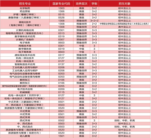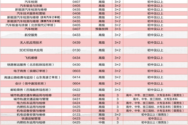 高級技工: 招收初中畢業生,學制5年(3年+2年);高中畢業生學制為3年;中技、中專及以上學歷相近專業畢業生,學制2年;