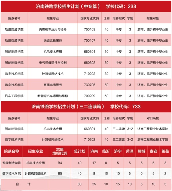 注:三二連讀計劃,前三年注冊濟南鐵路學校中專學籍,免學費;后兩年注冊濟南工程職業技術學院高職大專學籍,根據公辦院校收費標準收學費。五年全部在學校組織教學,第三年經轉段考試合格方可注冊濟南工程職業技術學院學籍,修滿相應專業教學計劃規定的全部課程,成績合格,準予畢業,頒發普通高等學校 全日制?飘厴I證書。