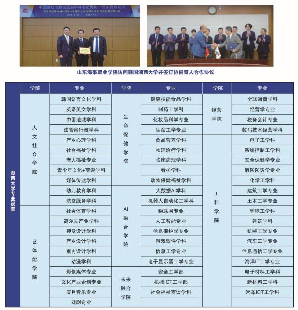 國際班介紹作為濰坊市政府服務國家“一帶一路”發展戰略和貫徹落實省委省政府招才引智重要部署組成部分,依托韓國湖西大學設立濰坊市濰城區政府駐韓國牙山人才工作服務站為契機,以培養中日韓自貿區建設高端人才為目的,山東海事職業學院與韓國湖西大學共同簽署人才培養合作共建方案,由國際學院和中職學院聯合實施,設立3+4本科直升湖西大學國際班。前三年在中職學院除學習基礎文化課程外,增加韓語課程和韓國湖西大學預本銜接課程;學習期滿達到相應韓語等級要求,后四年直接升入韓國湖西大學本科專業學習深造。